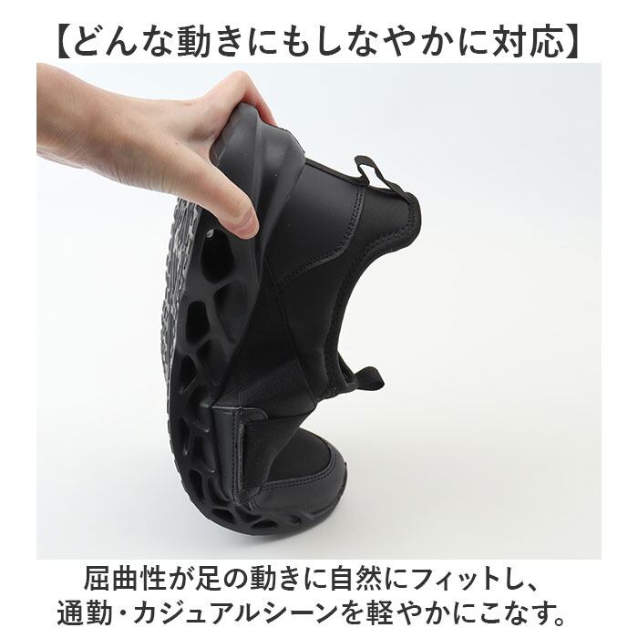 ・屈曲性が足の動きに自然にフィットし、通勤・カジュアルシーンを軽やかにこなす。