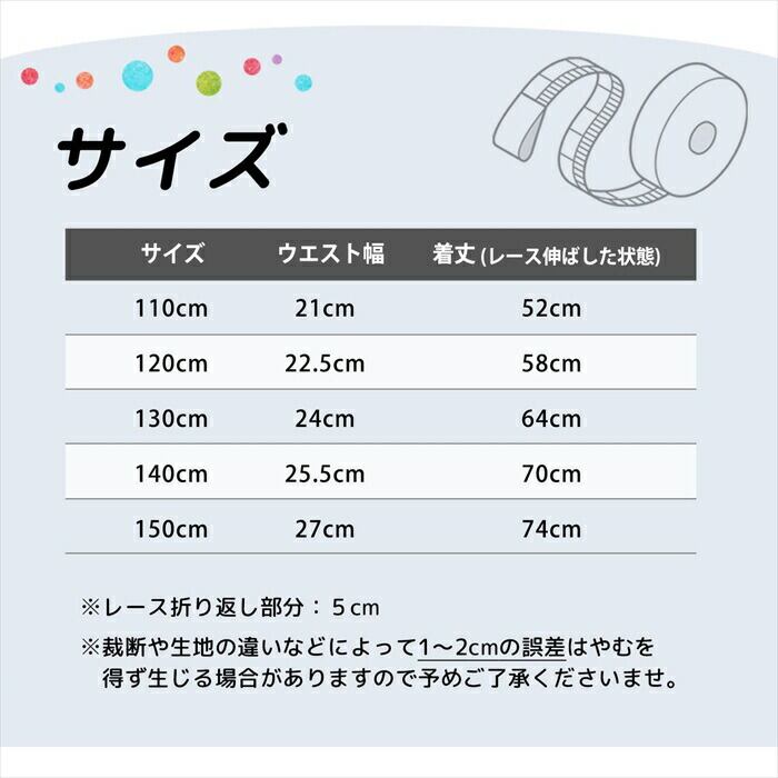 120cm:[ウエスト1/2]22.5cm/[レングス(伸ばした状態)]58cm/[レース折り返し部分]5cm