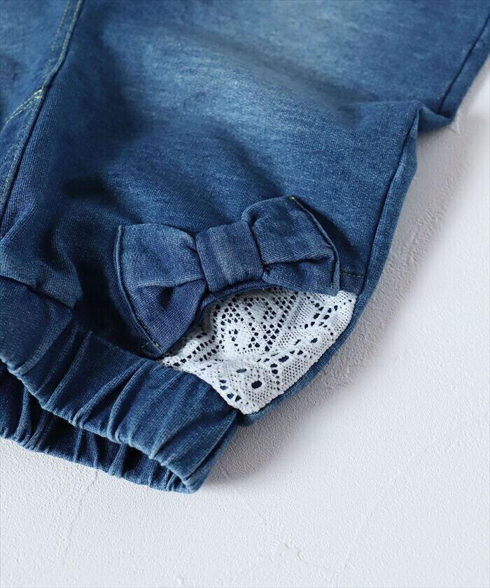 ・軽やかなカジュアルさを演出するレース付きのカットソーデニムパンツ。