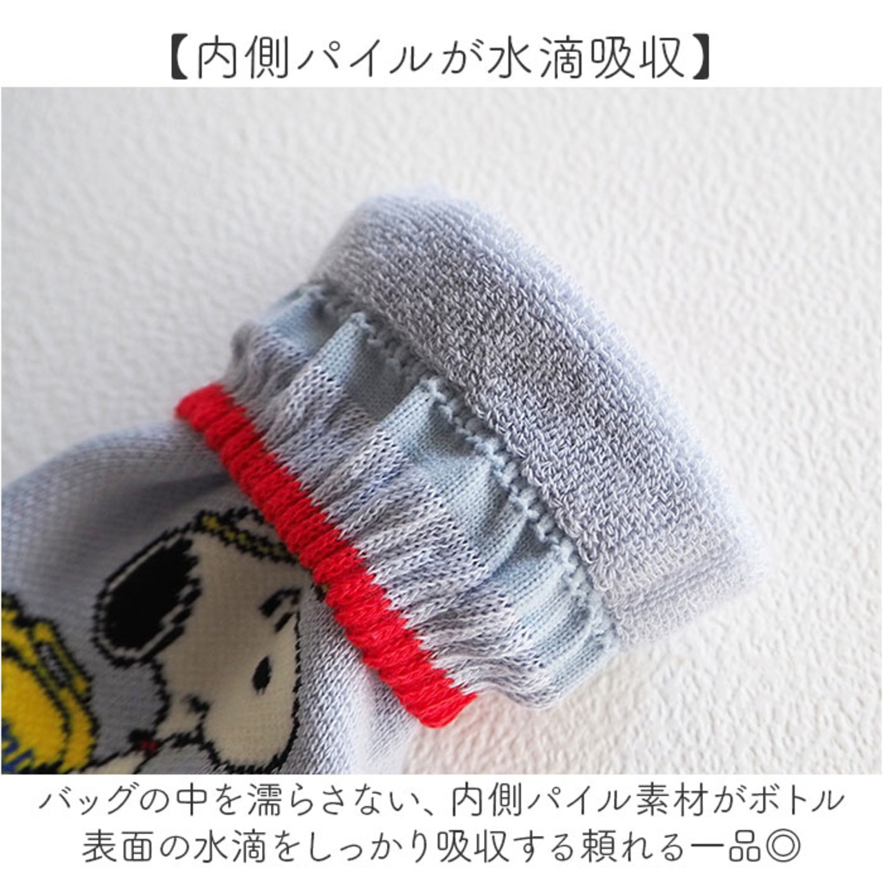 ・水滴吸収&傷防止機能を備えた、スヌーピーデザインのニットBOTOCOボトルカバー。