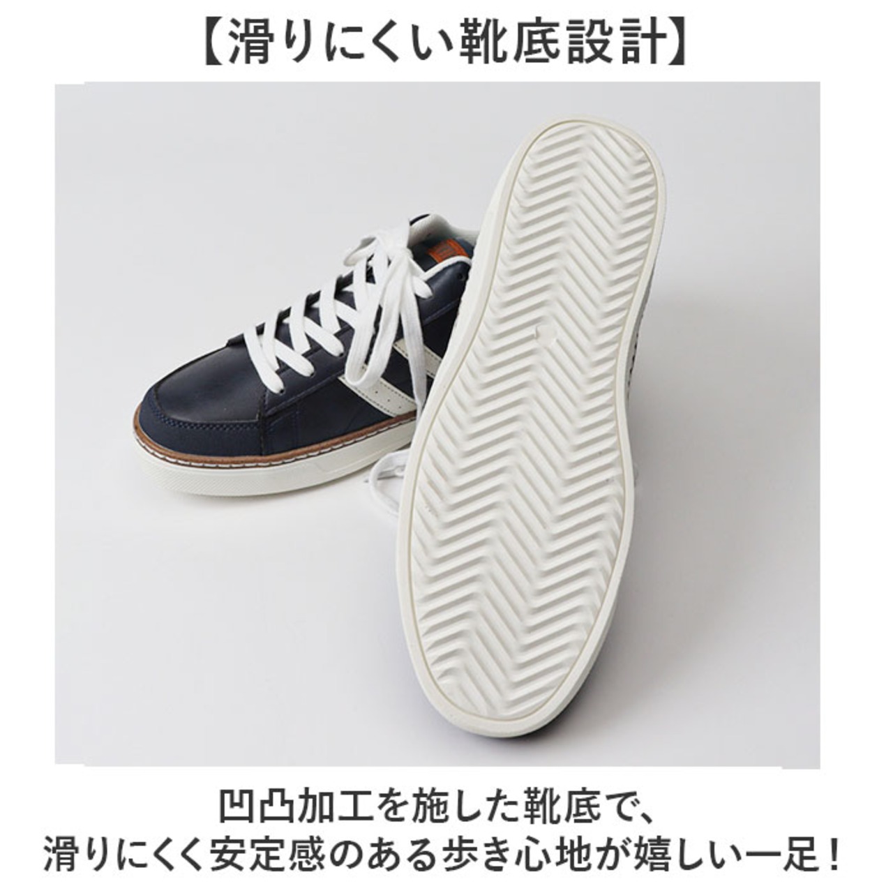 ・凹凸加工を施した靴底で、滑りにくく安定感のある歩き心地が嬉しい一足!