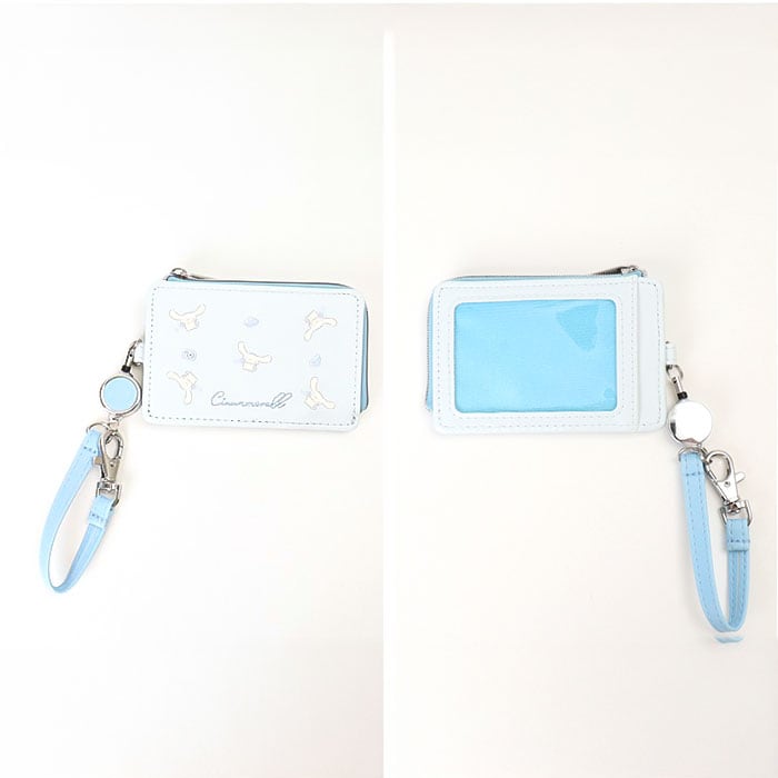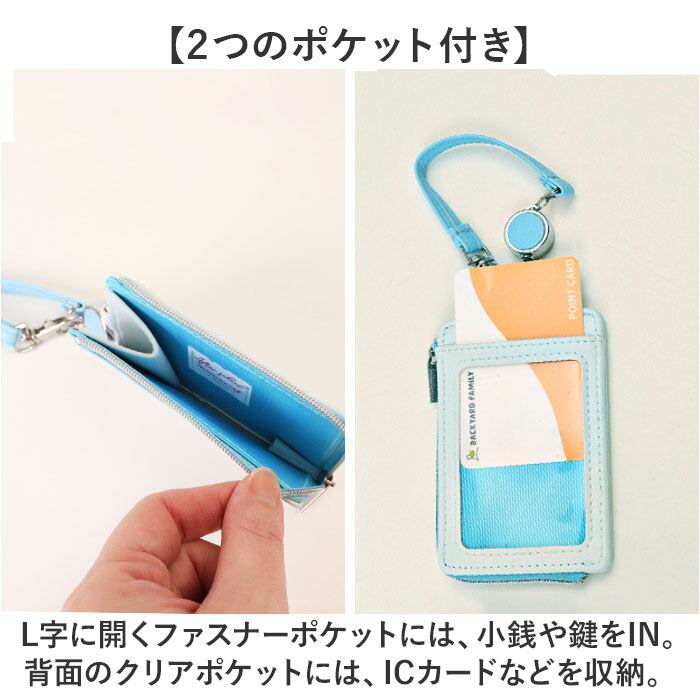 ・L字に開くファスナーポケットには、小銭や鍵をIN。背面のクリアポケットには、ICカードなどを収納。