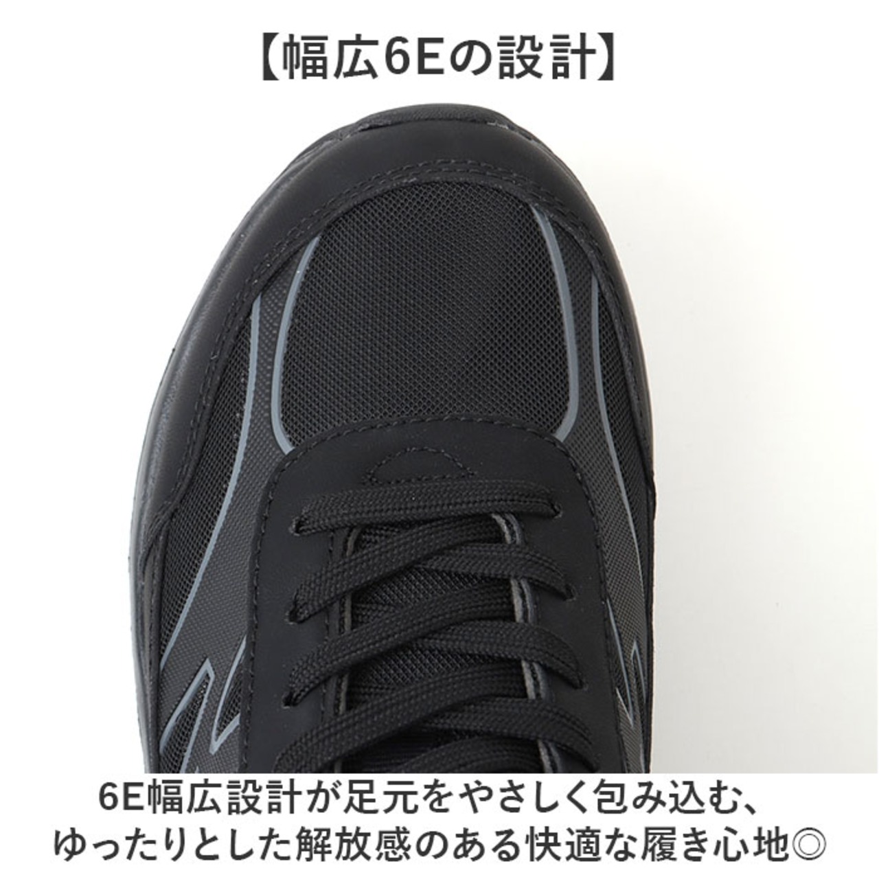 6E幅広設計が足元をやさしく包み込む、ゆったりとした解放感のある快適な履き心地◎