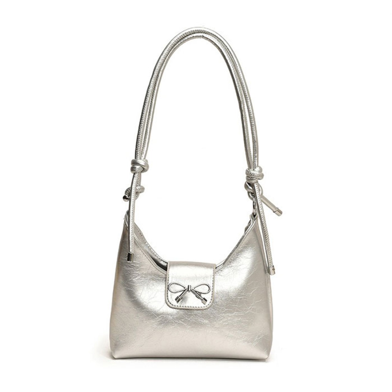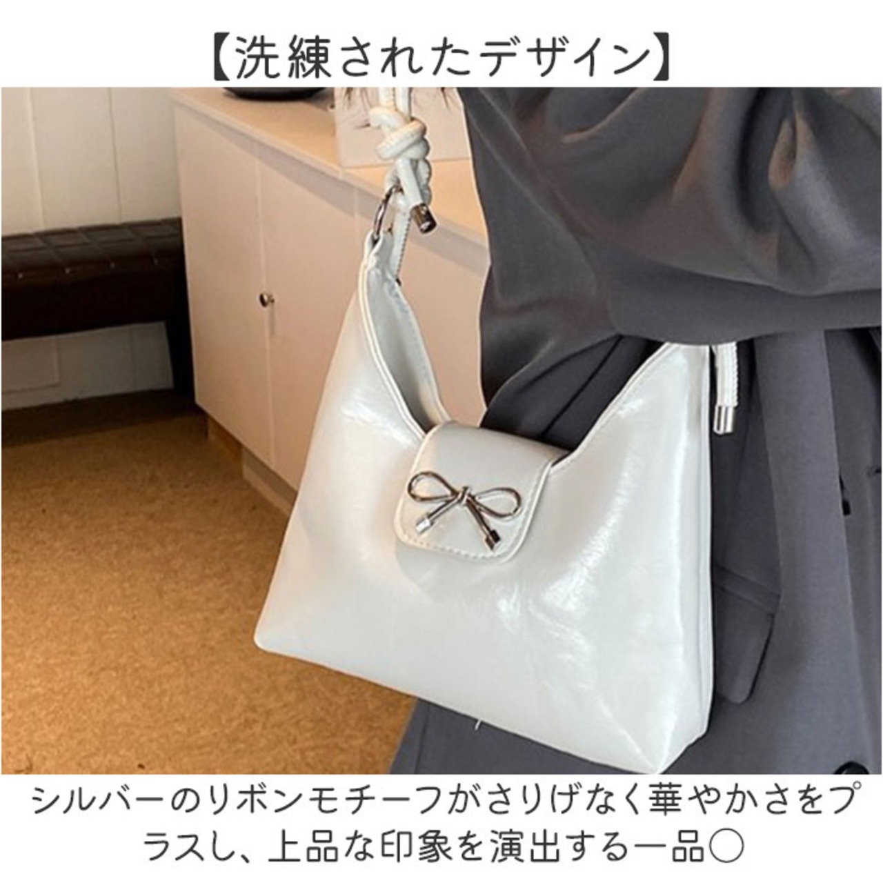 ・シルバーのリボンモチーフがさりげなく華やかさをプラスし、上品な印象を演出する一品〇
