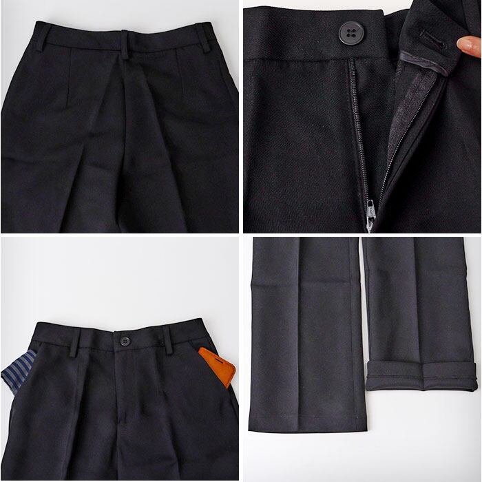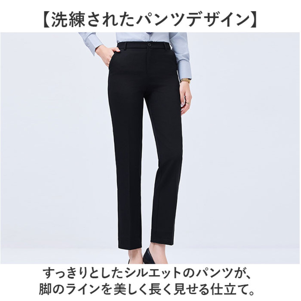・すっきりとしたシルエットのパンツが、脚のラインを美しく長く見せる仕立て。