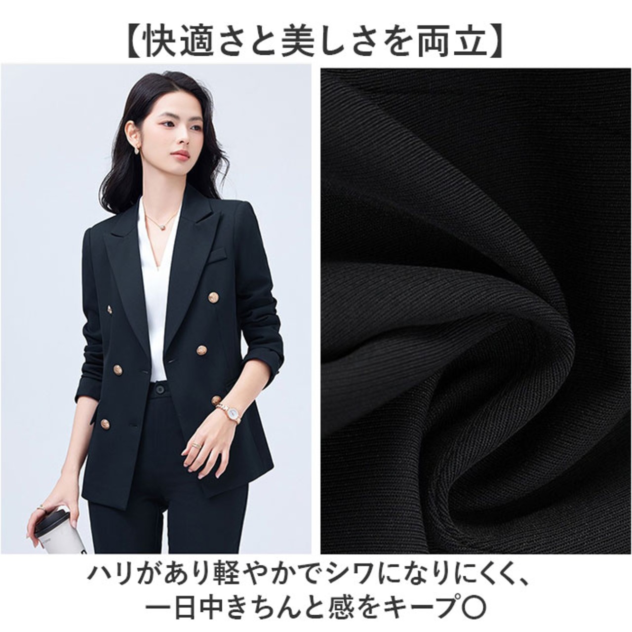 ・ハリがあり軽やかでシワになりにくく、一日中きちんと感をキープ〇