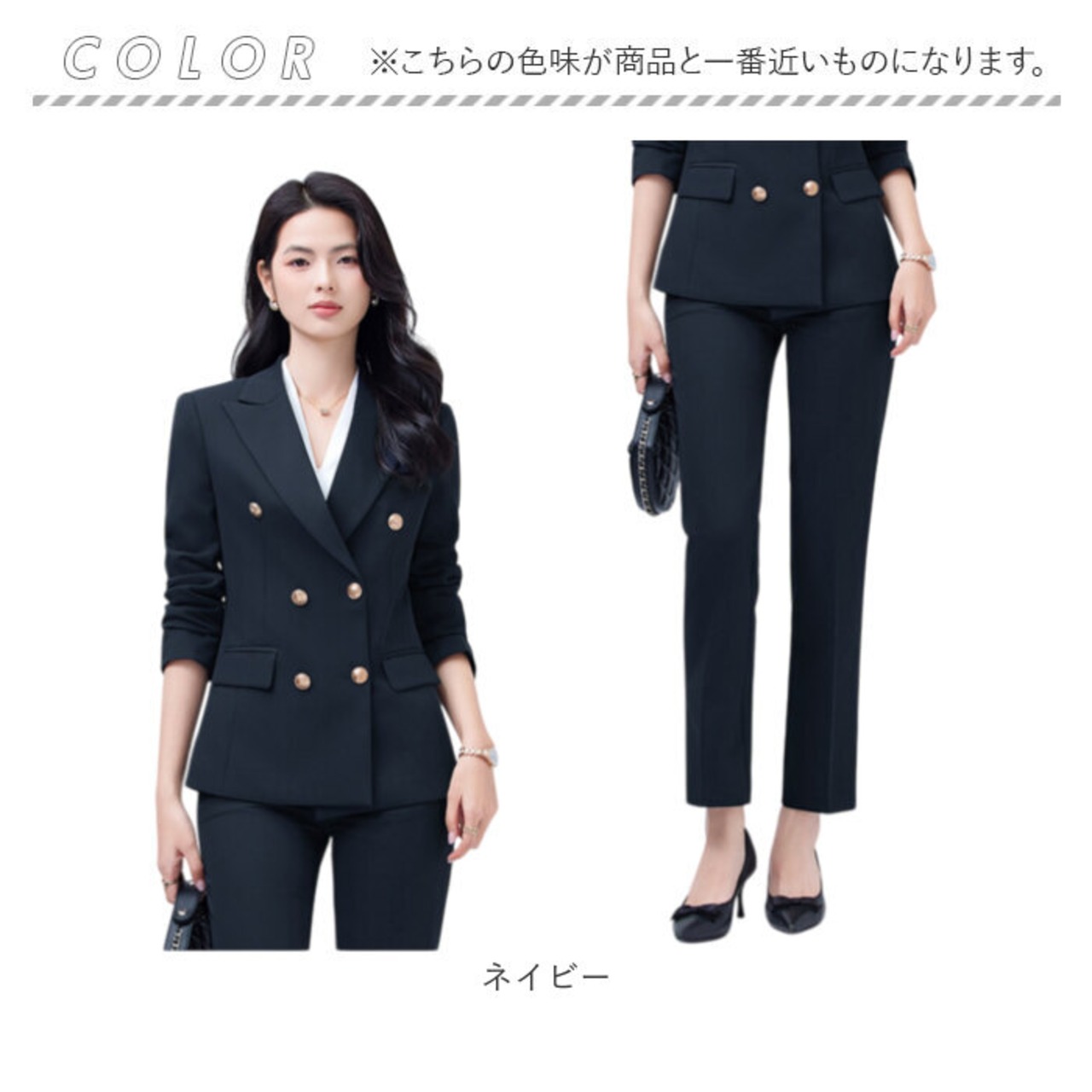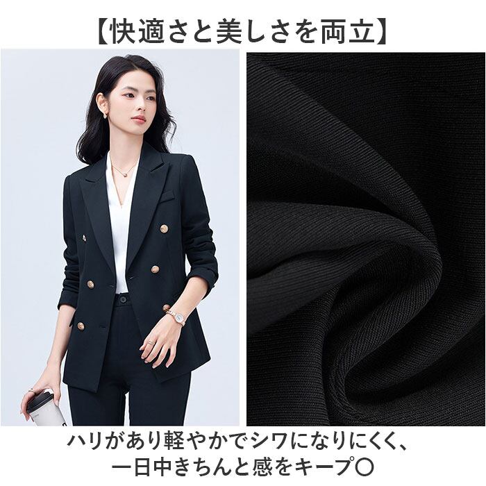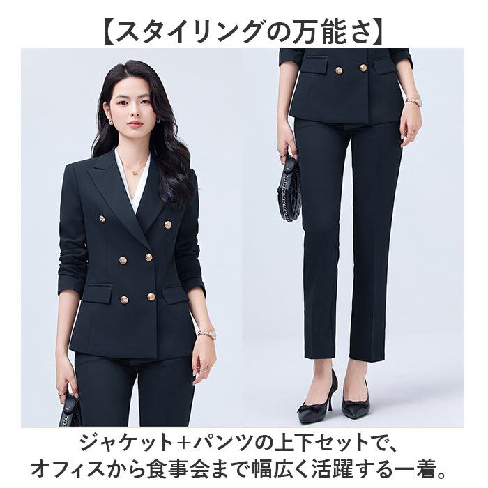 ・ジャケット+パンツの上下セットで、オフィスから食事会まで幅広く活躍する一着。
