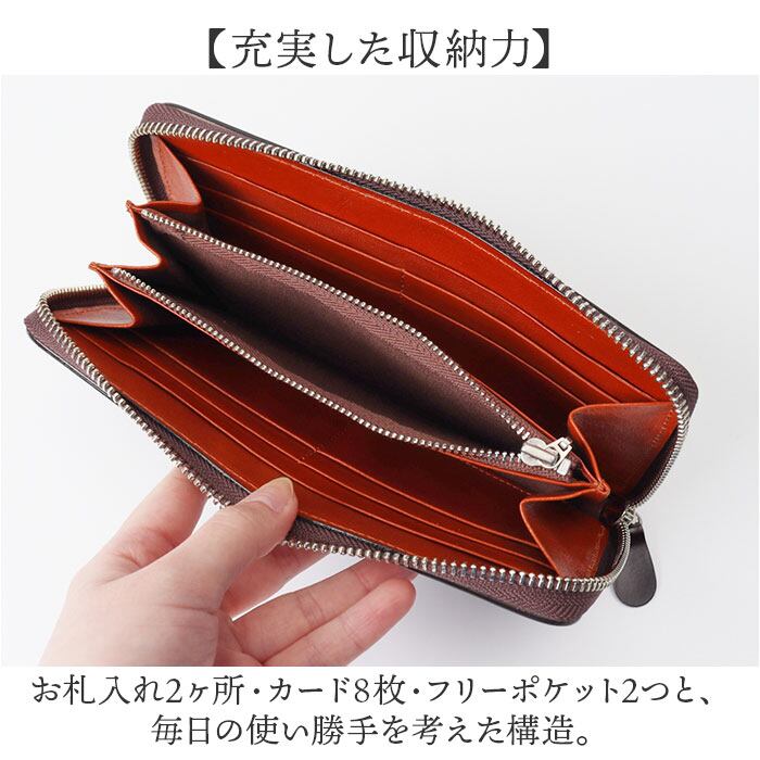 ・お札入れ2ヶ所・カード8枚・フリーポケット2つと、毎日の使い勝手を考えた構造。