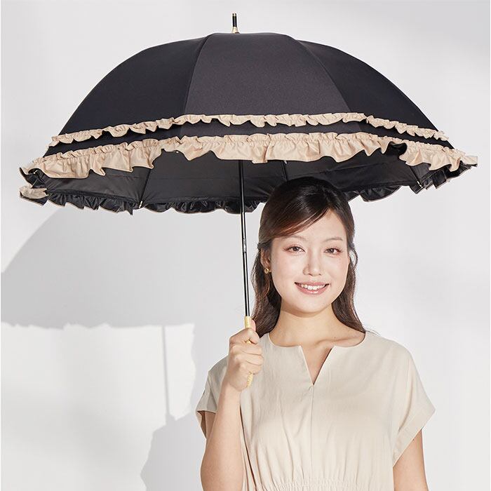 ・大人可愛いダブルフリルと完全遮光機能を兼ね備えた、上品なショート丈日傘。