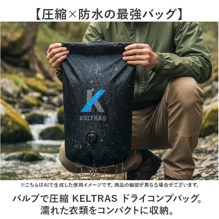 ・バルブで圧縮 KELTRAS ドライコンプバッグ。濡れた衣類をコンパクトに収納。