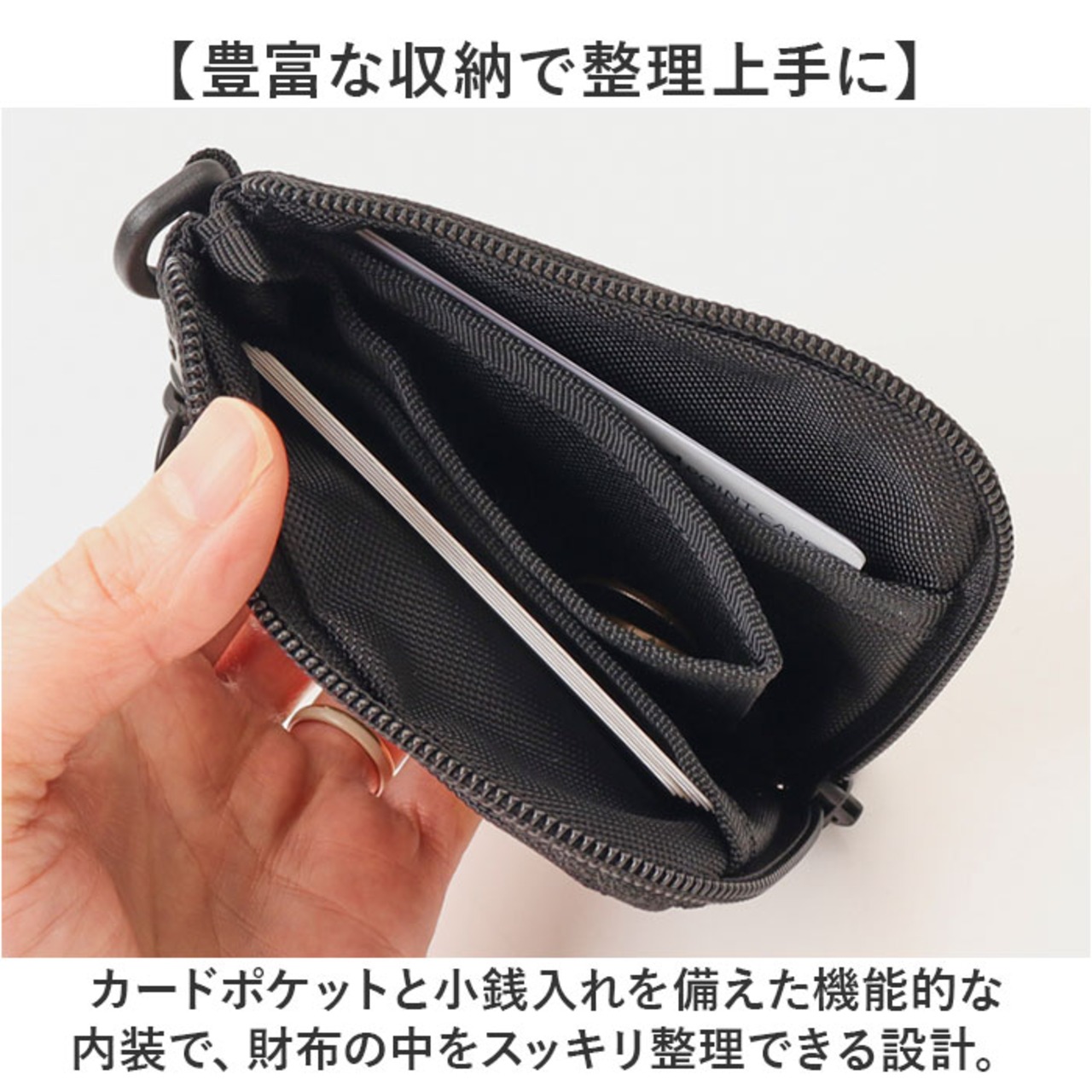 ・カードポケットと小銭入れを備えた機能的な内装で、財布の中をスッキリ整理できる設計。