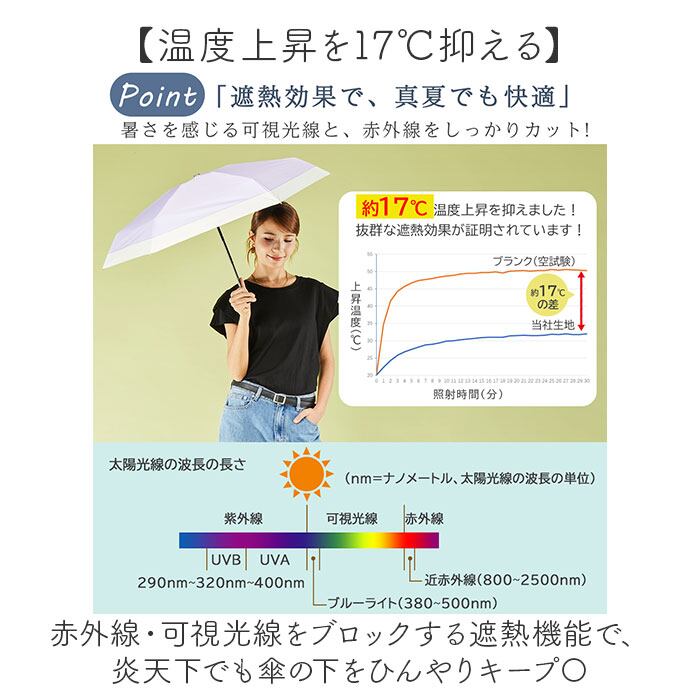 ・赤外線・可視光線をブロックする遮熱機能で、炎天下でも傘の下をひんやりキープ〇