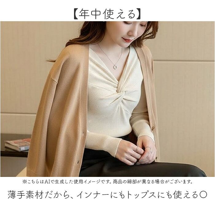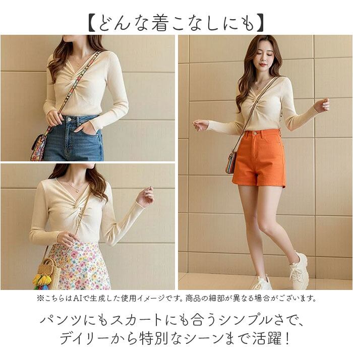 ・胸元のねじりデザインが、シンプルなコーデに華やかさと上品な抜け感を添えるタイトニット。