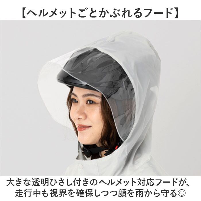 ・大きな透明ひさし付きのヘルメット対応フードが、走行中も視界を確保しつつ顔を雨から守る◎