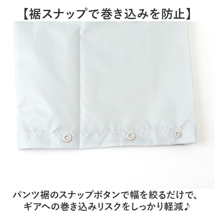 ・パンツ裾のスナップボタンで幅を絞るだけで、ギアへの巻き込みリスクをしっかり軽減♪