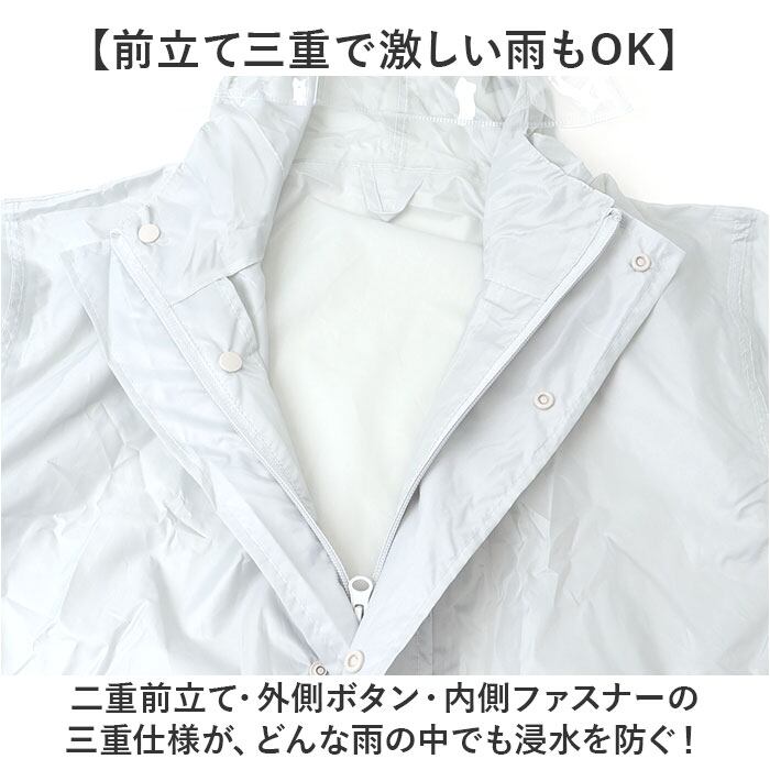 ・二重前立て・外側ボタン・内側ファスナーの三重仕様が、どんな雨の中でも浸水を防ぐ!