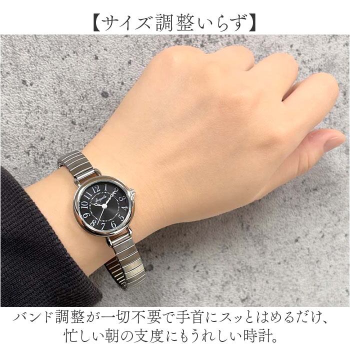 ・バンド調整が一切不要で手首にスッとはめるだけ、忙しい朝の支度にもうれしい時計。