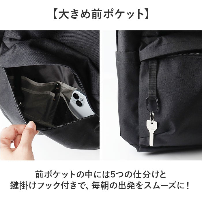 ・前ポケットの中には5つの仕分けと鍵掛けフック付きで、毎朝の出発をスムーズに!