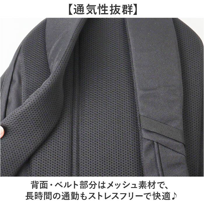 ・背面・ベルト部分はメッシュ素材で、長時間の通勤もストレスフリーで快適♪