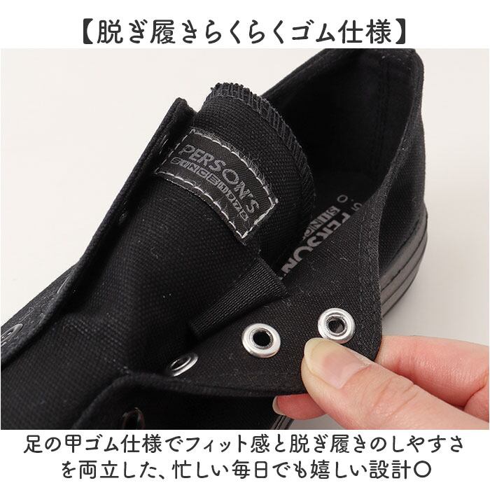 ・足の甲ゴム仕様でフィット感と脱ぎ履きのしやすさを両立した、忙しい毎日でも嬉しい設計〇