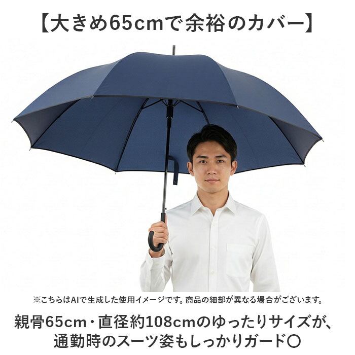 ・親骨65cm・直径約108cmのゆったりサイズが、通勤時のスーツ姿もしっかりガード〇