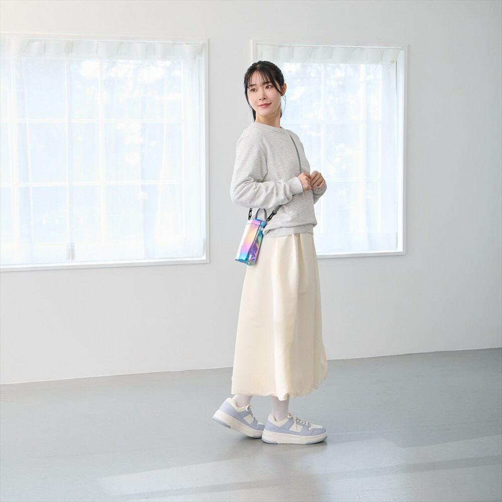 ・底マチをたためば、フラットなシルエットに変身。スマホや小物を入れて、サコッシュのようにも使えます。