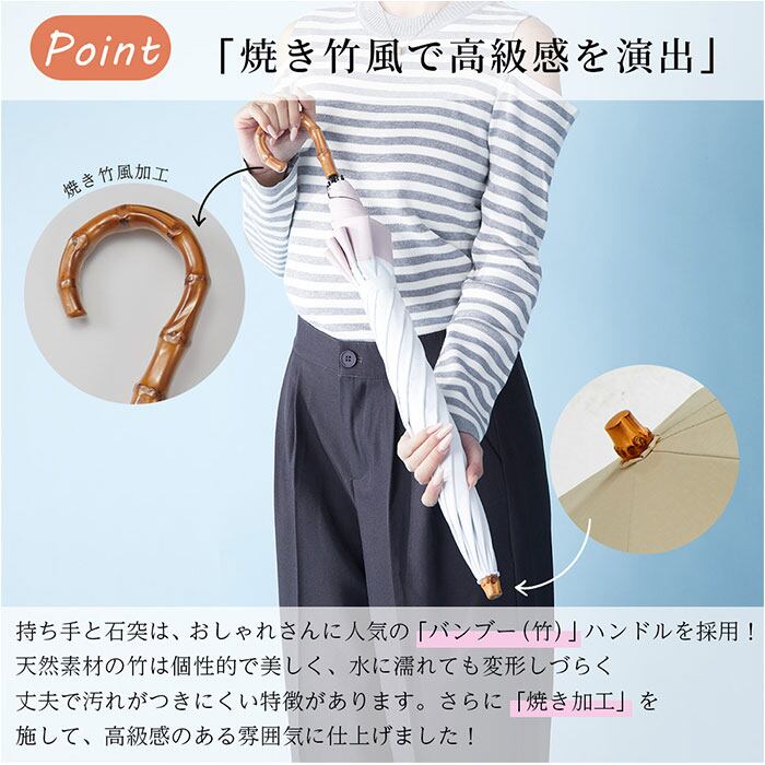 ・持ち手と石突は竹を採用し、焼き加工を施したこだわりデザイン。