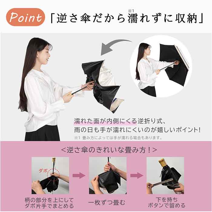 ・傘を逆さにたたむ設計で濡れた面が内側に収まり、雨の日の収納ストレスをゼロに◎