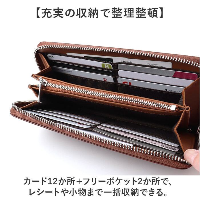 ・カード12か所+フリーポケット2か所で、レシートや小物まで一括収納できる。