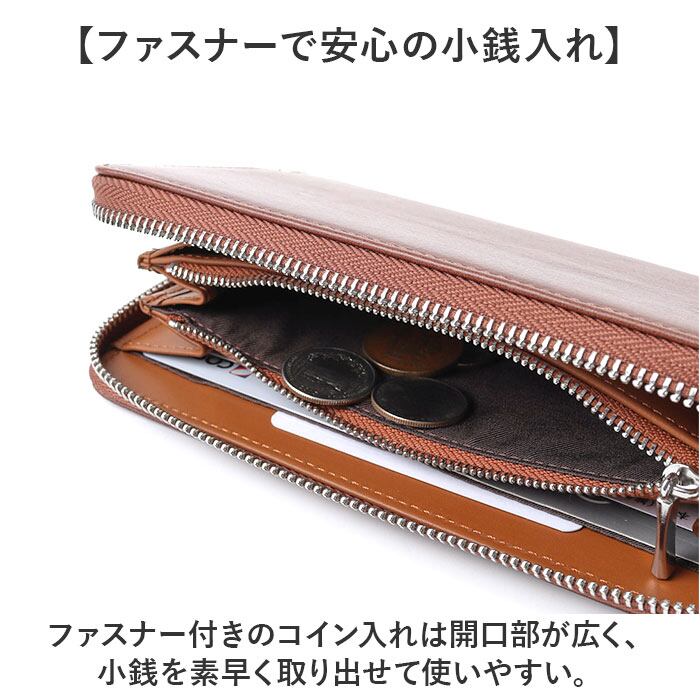 ・ファスナー付きのコイン入れは開口部が広く、小銭を素早く取り出せて使いやすい。