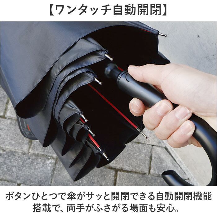 ・ボタンひとつで傘がサッと開閉できる自動開閉機能搭載で、両手がふさがる場面も安心。