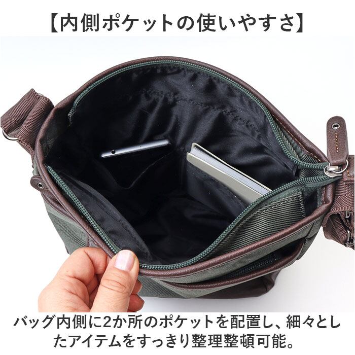 ・バッグ内側に2か所のポケットを配置し、細々としたアイテムをすっきり整理整頓可能。