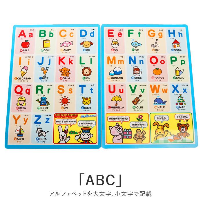 ・「ABC」・・・アルファベットを大文字、小文字で記載。読み方と、その文字がイニシャルになる「もの」の英名もイラストと一緒に書いてあるから、英語の勉強にも♪