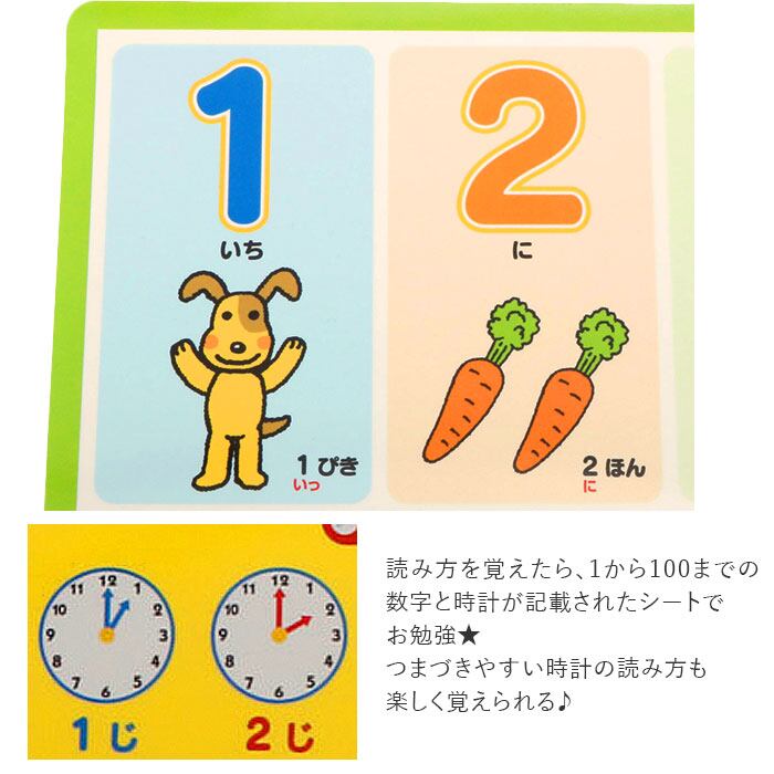 ・「すうじ」・・・1から10までの読み方と「もの」の数え方をキュートなイラストと一緒に記載。読み方を覚えたら、1から100までの数字と時計が記載されたシートでお勉強★つまづきやすい時計の読み方も楽しく覚えられる♪