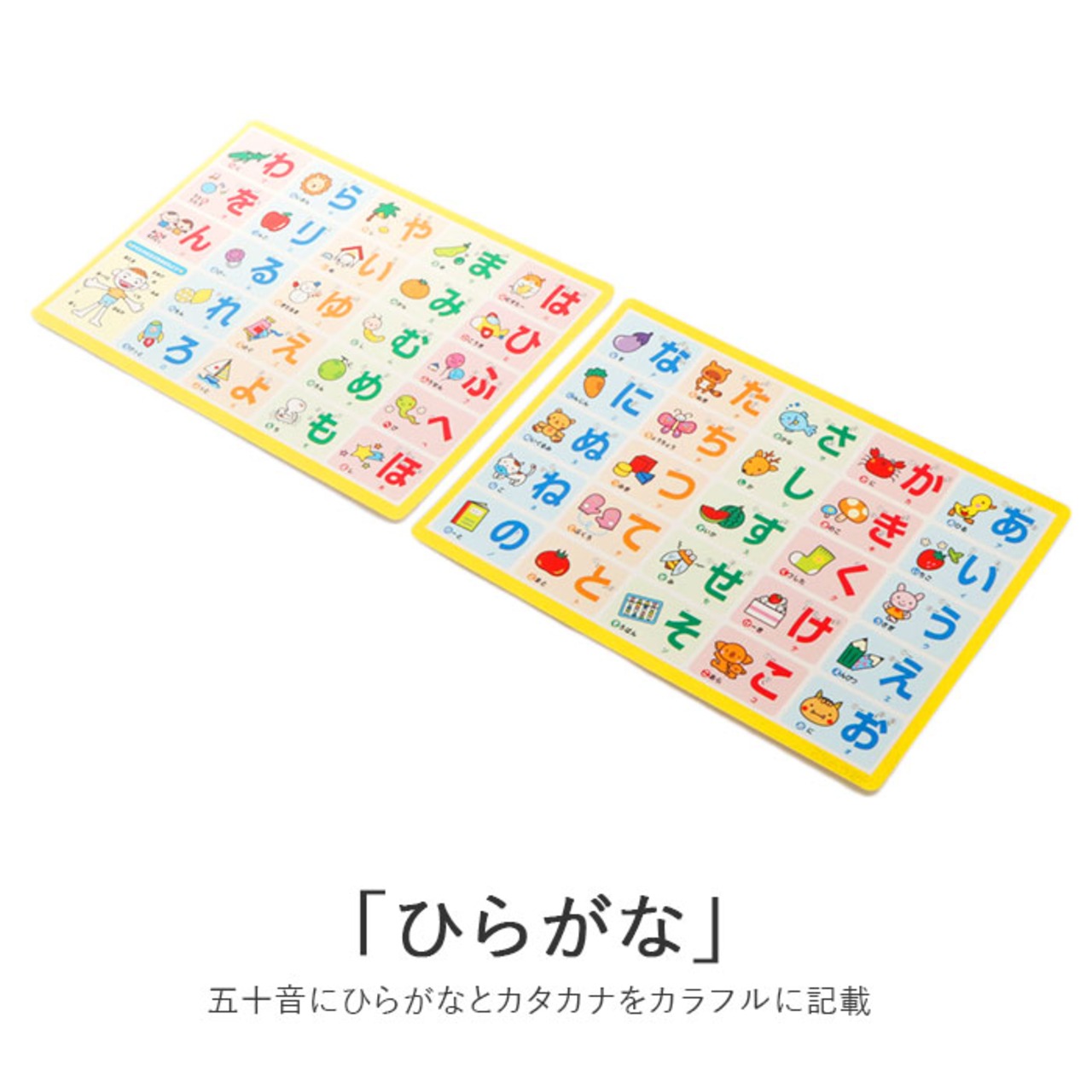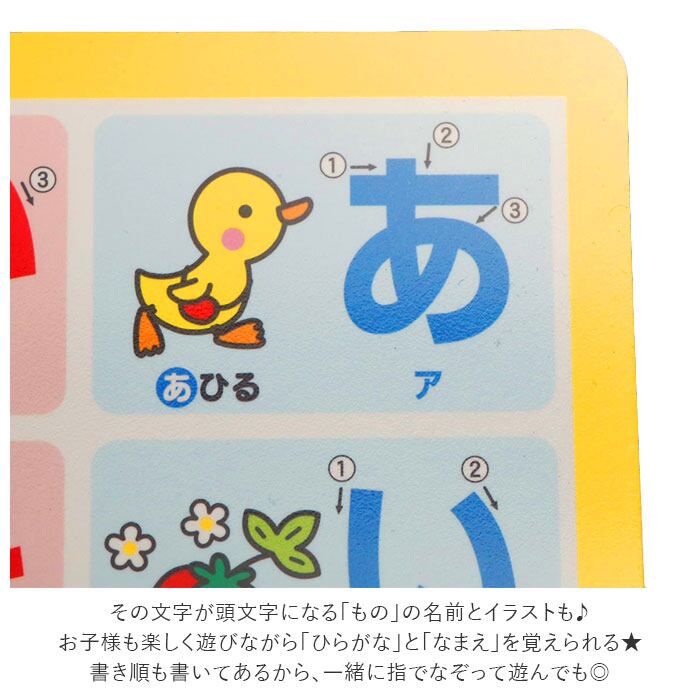 ・「ひらがな」・・・五十音にひらがなとカタカナをカラフルに記載。文字の隣には、その文字が頭文字になる「もの」の名前とイラストも載っているから、お子様も楽しく遊びながら「ひらがな」と「なまえ」を覚えられる★書き順も書いてあるから、一緒に指でなぞって遊んでも◎。