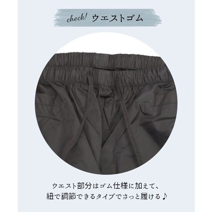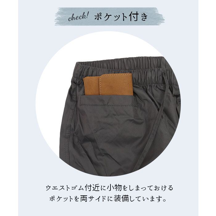 ・パンツはウエストゴム仕様に加えて紐で調節できるタイプ。ウエストゴム付近に鍵などの小物をしまっておけるポケットを両サイドに装備。