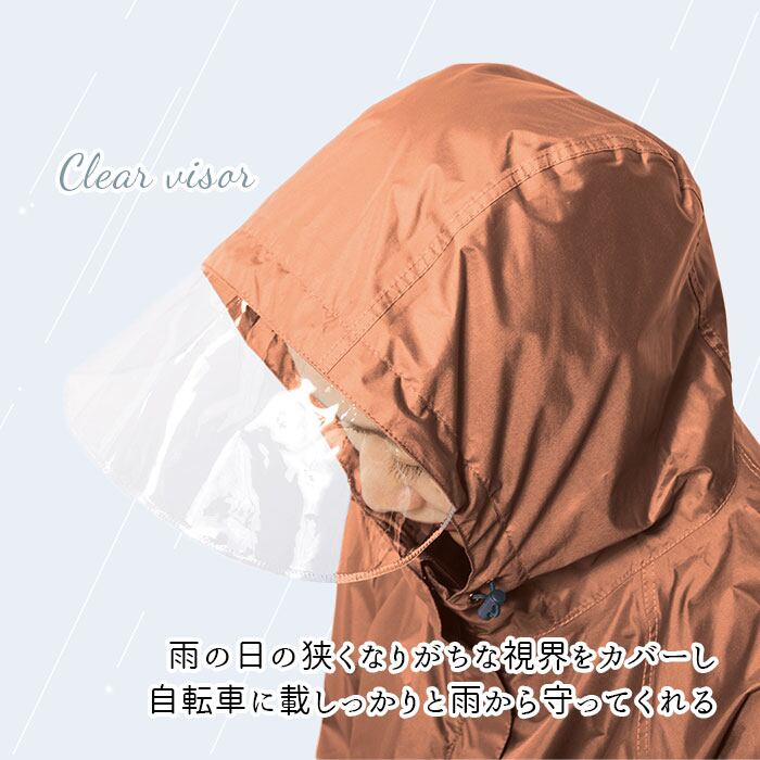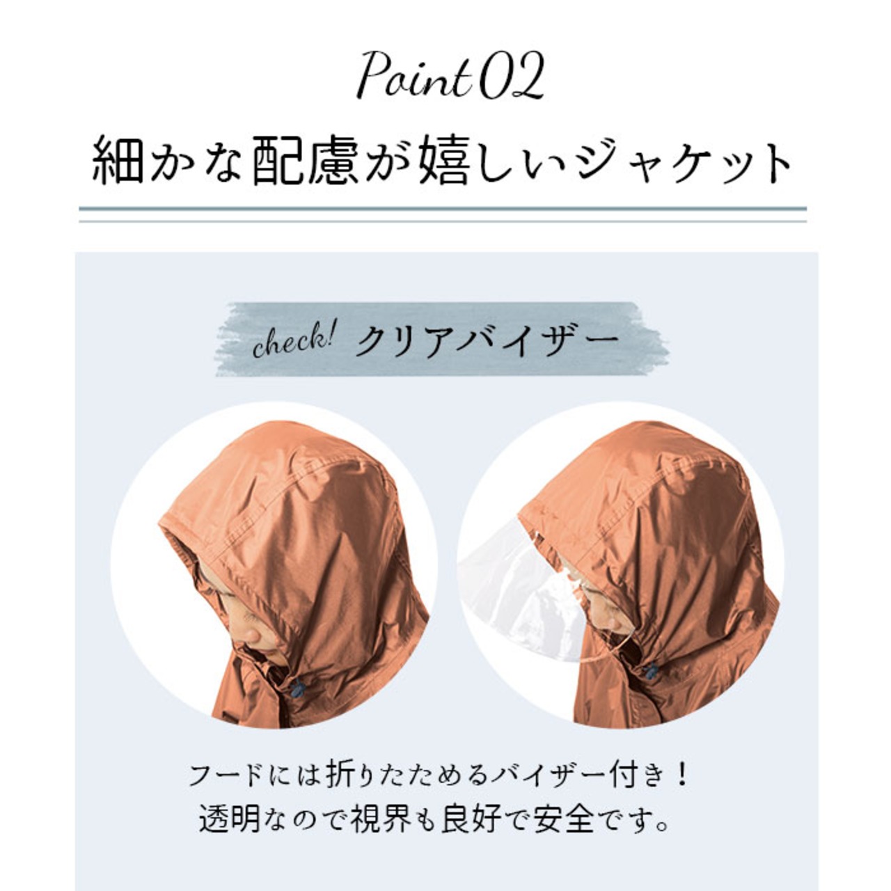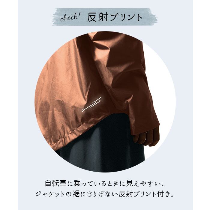 ・ジャケットの裾にはさりげない反射板のプリント付き。フードには雨から顔回りを守ってくれる折り込み式の透明ツバを装備。