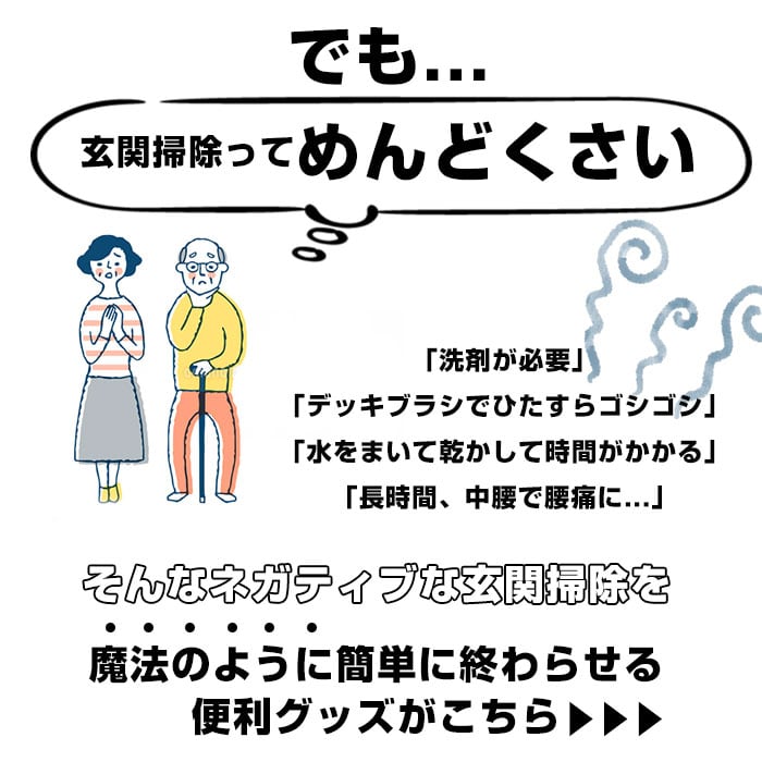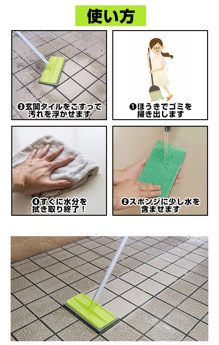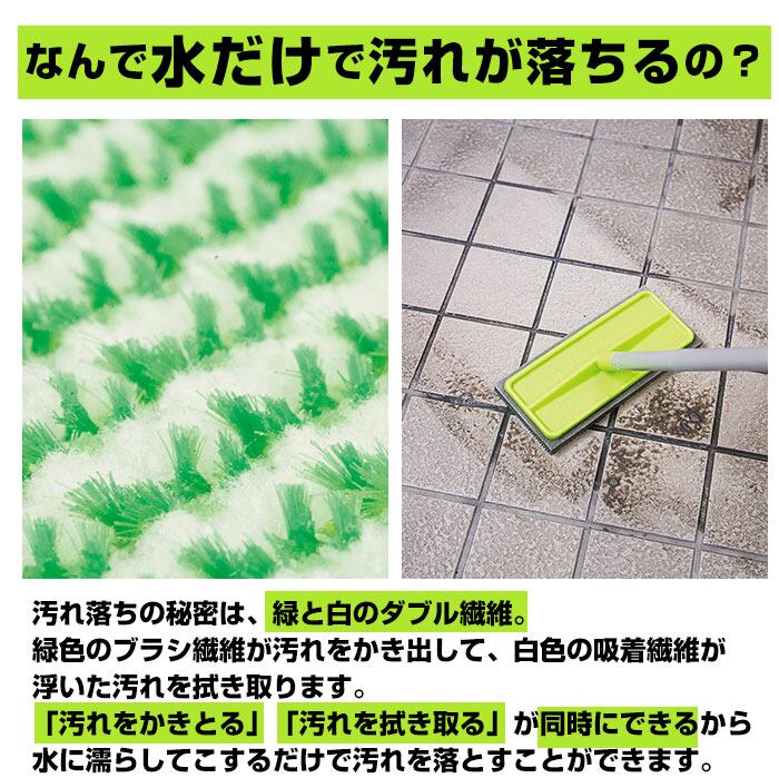 ・緑色のブラシ繊維が玄関タイルやコンクリートなどの凹凸に入りこんで汚れをかき出し、白色の吸着繊維が浮いた汚れを拭き取る!