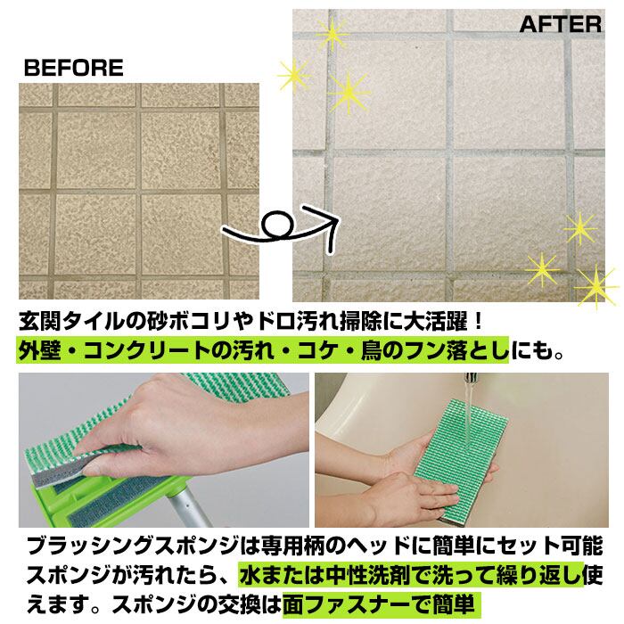 玄関 タイル 掃除 ブラシ 通販 玄関掃除 タイル 外壁 コケ落とし 掃除グッズ コンクリート スポンジ 持ち手 玄関タイル ベランダ お掃除 洗剤不要 掃除用品 アズマ バルコニー 簡単 汚れ落とし ブラッシングスポン