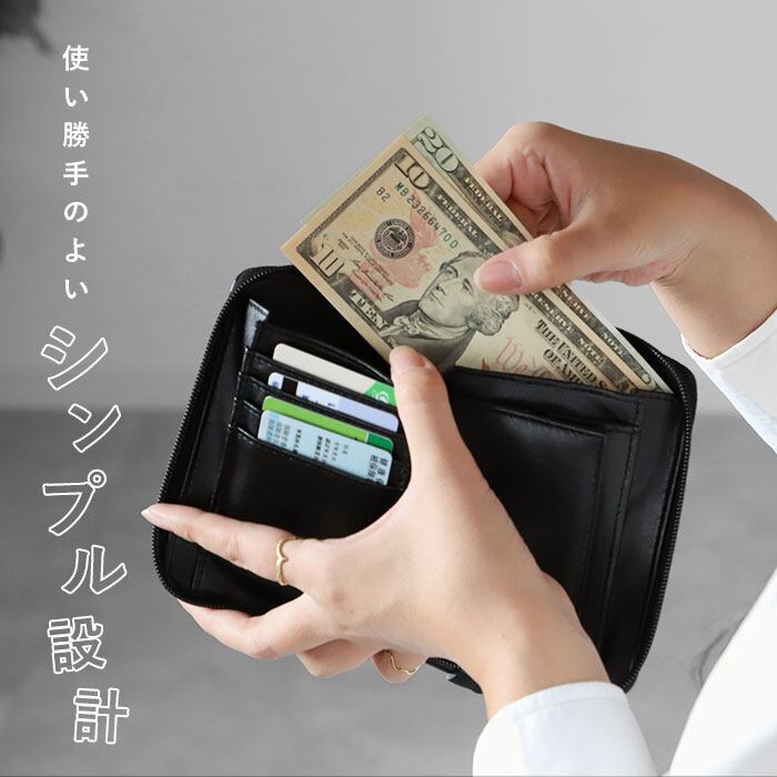 ・開口部はファスナーがコの字型に大きく開くラウンドジップ二つ折りタイプ。コインやカード類がこぼれ落ちる心配ナシ!