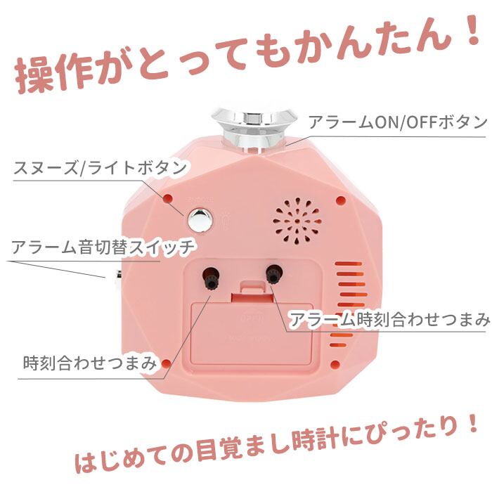 ・軽快なメロディ音にスッキリと目覚められるベル音。選べる2種類のアラームと「モーニング♪」の掛け声で、毎朝心地よくウェイクアップ♪(※側面のスイッチでアラーム音の切り替えができます。)