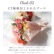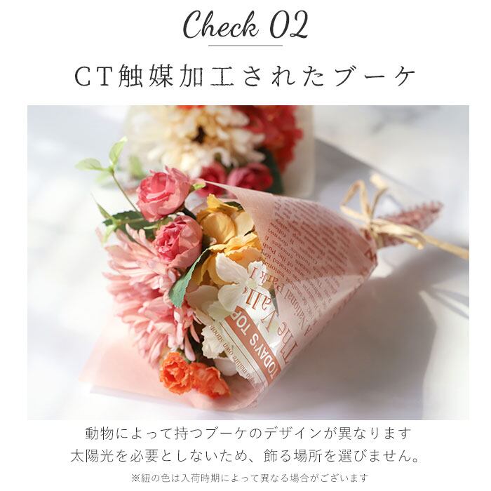 ・マスコットが抱えている花束は、消臭・抗菌・マイナスイオン効果のあるCT触媒加工が施された特別なブーケ。環境にやさしく、人体やペットにも安全。(※CT触媒・・・電荷移動型酸化還元)