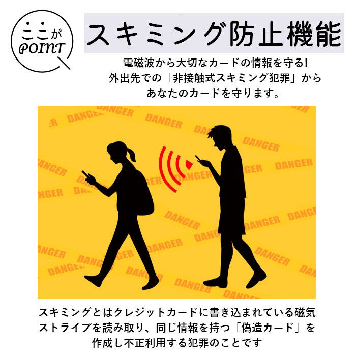 ・外出先での非接触式スキミング犯罪からあなたの大切なカード情報を守る「スキミング防止機能」搭載!クレジットカードやICカード類が安心して収納できる。