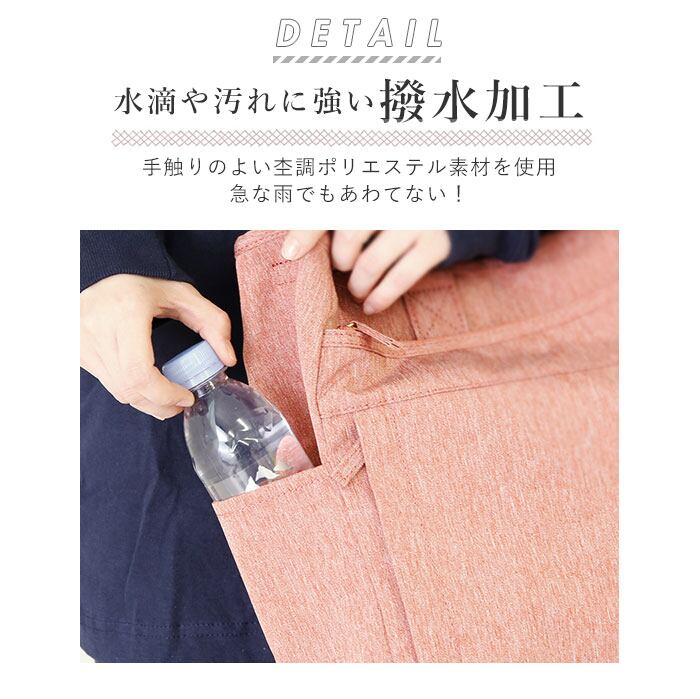 ※この製品は、はっ水加工を施した生地を使用しておりますが、防水構造ではありませんので、強い雨の中での使用などでは、製品上縫い目等の部分から浸水するおそれがありますのでご注意ください。また、経年や過度の水洗いによりはっ水加工が低下する恐れがありますのでご注意ください。