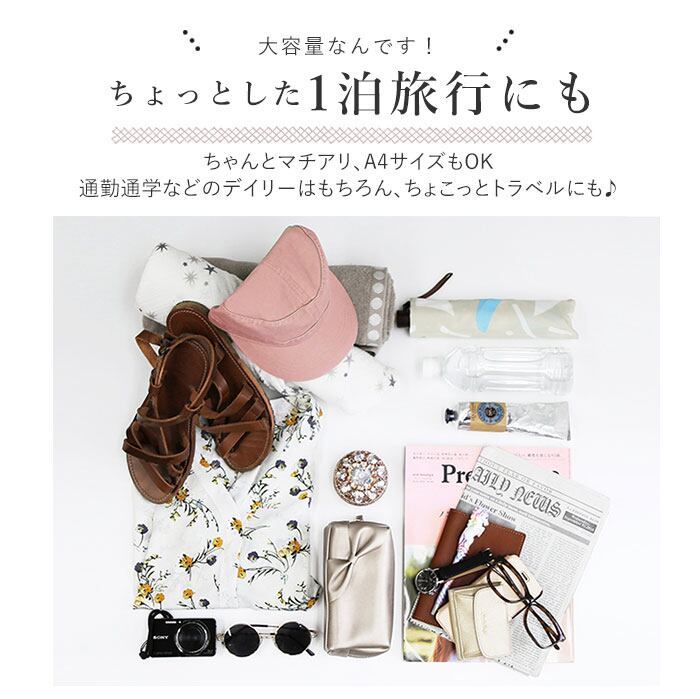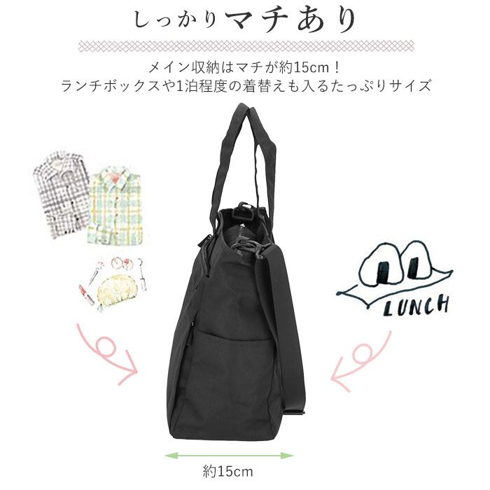 ・メイン収納はマチがしっかり15cm!A4の書類・雑誌が余裕で収まるたっぷりサイズ。さらにペットボトルや折りたたみ傘等が入る内側サイドポケット×2の他、内ポケットが合計5つで抜群の収納力。