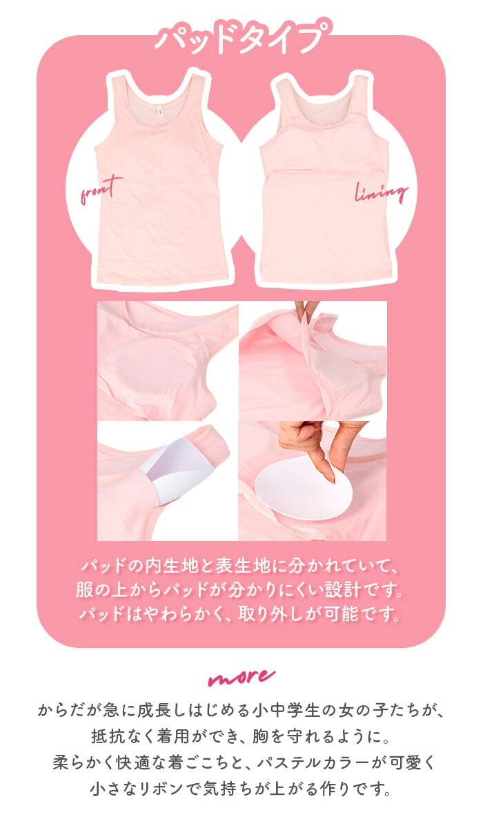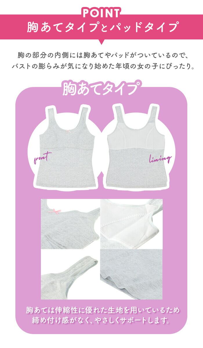 ・胸の部分の内側には胸あてやパッドがついているので、バストの膨らみが気になり始めた年頃の女の子にぴったり。(※パッドは取り外しが可能)。