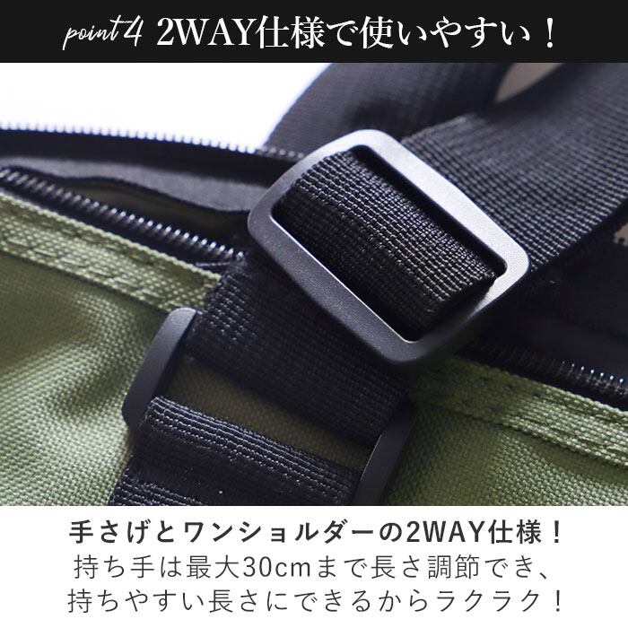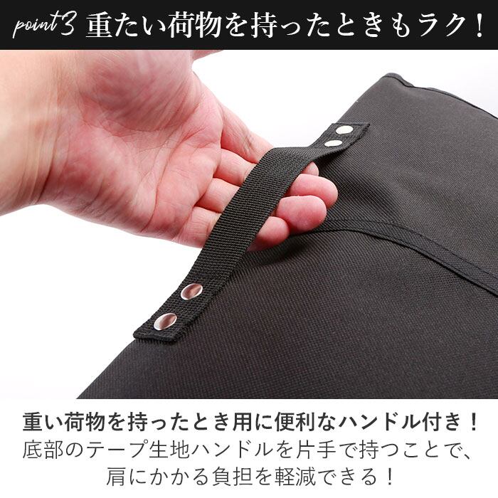 ・トートの持ち手は長さを最大30cmまで調節可能。肩掛けにしやすく、荷物が重たくなった時には、トート底部のテープ生地ハンドルを片手で持つことで、肩にかかる負担を軽減。たくさんペットボトル飲料を買った時も、パパさんが持ちやすいやさしい造り。