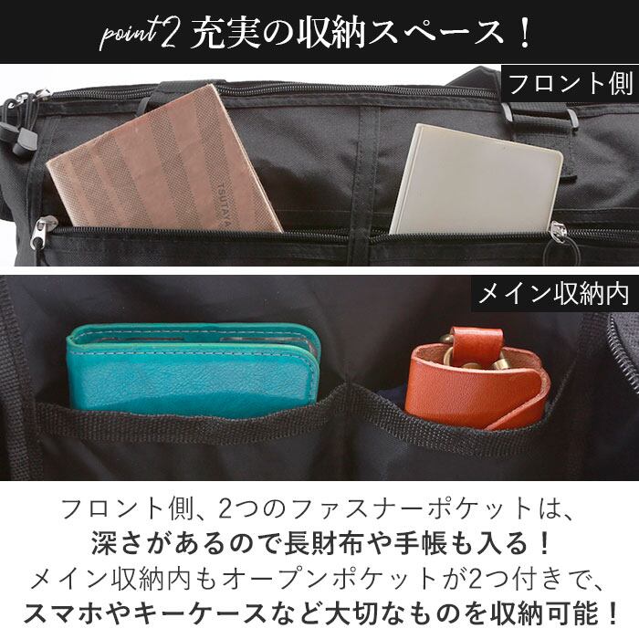 ・フロント側に配置された2つのファスナーポケットが印象的なデザイン。深さがしっかりとあるポケットで、長財布やB6サイズの単行本や手帳もINできる♪