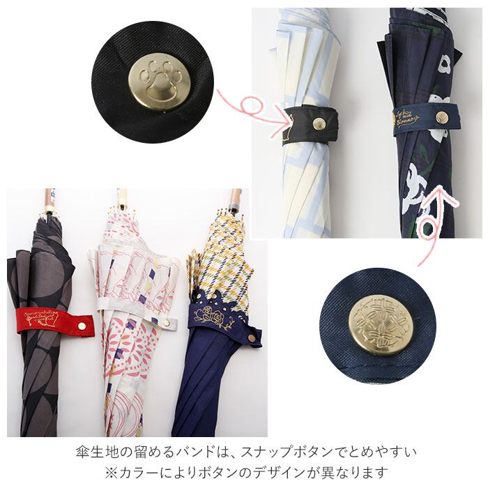 ・傘生地の留めるバンドは、スナップボタンでバチンっと留めやすい!カシメボタンはツヤのあるゴールドタイプとツヤ消しアンティークゴールドの2タイプ。(※カラーによりボタンのデザインが異なります。)