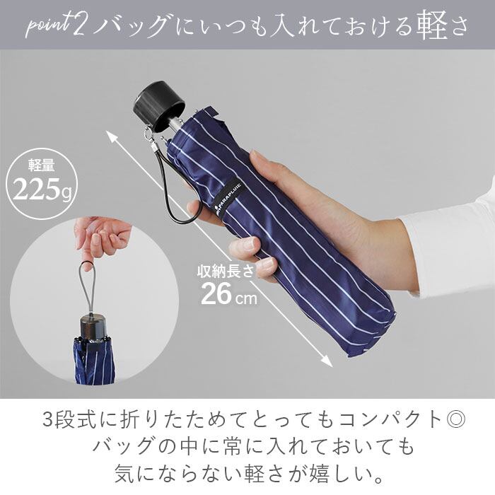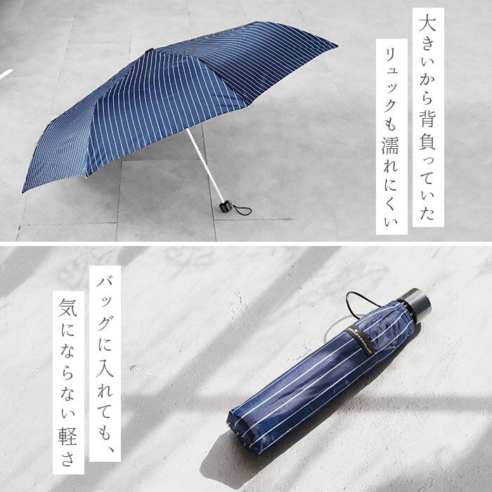 ・親骨には軽量なアルミ骨を採用。3段式にコンパクトに折りたためて、ビジネスバッグに入れても気にならない軽さが嬉しい。